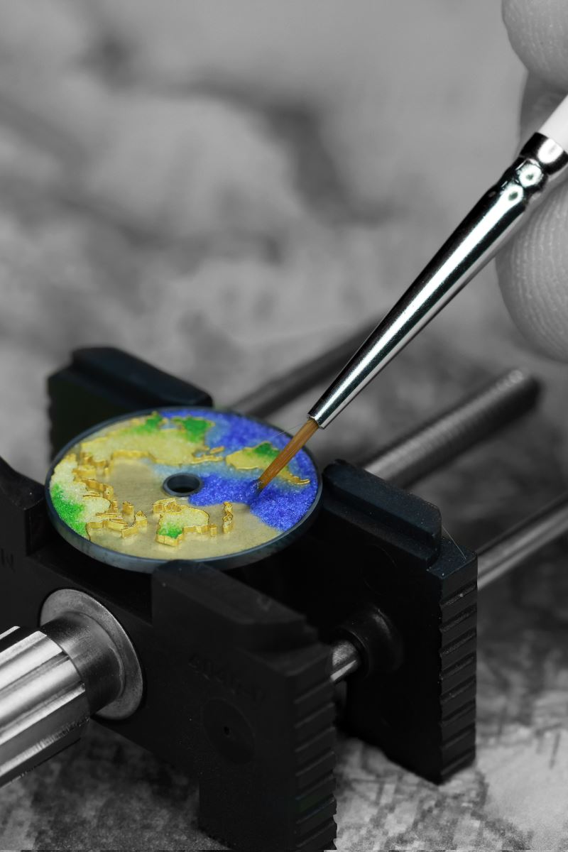 Nghệ nhân của Philippe Mark đang vẽ men trên mặt số đồng hồ bằng vàng